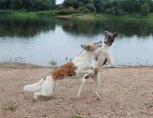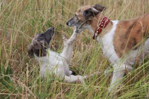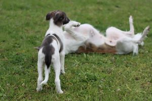Unser kleines Rudel, Alvy mag den Opa Borka sehr gerne. (August 23)