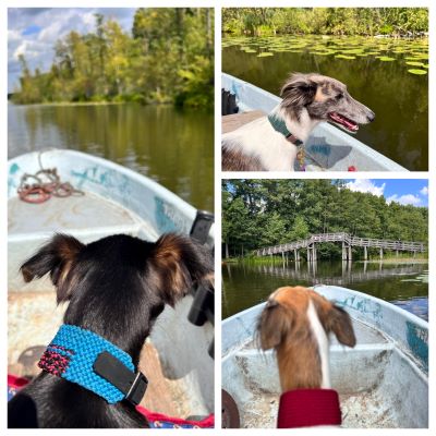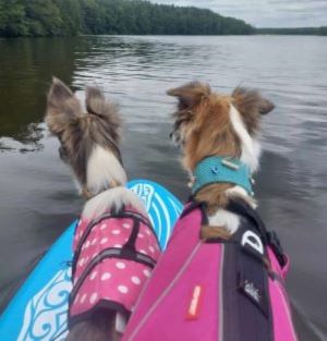 Alvy kommt gerne mit aufs Wasser, sie zeigt mehr Begeisterung als Yasha. Zwei mal mußten wir schon ins Wasser, dank der Schwimmwesten ging es anschließend weiter.
