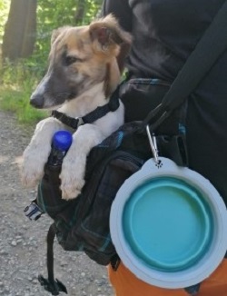 Auf unseren Spaziergängen gibt es immer etwas zu entdecken. Wenn wir länger liefen setzten wir Yasha in die große Laptoptasche, das fand sie toll und konnte alles beobachten.