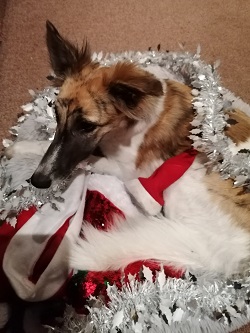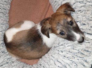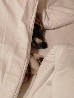 Langhaar Whippets lieben es kuschelig. Durch die Decke Decke weiß Yasha immer wo ihr Platz ist und sie kann relaxen.