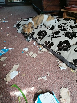 Wir übten das Yasha alleine bleiben kann. Es gab kleine Pappkartons und diese durften dann zerlegt werden. Natürlich waren auch kleine Überraschungen zum Knabbern versteckt. Heute macht sie keinen Quatsch mehr, oder fast keinen!