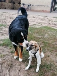 Bei der Begrüßung sieht Yasha wenig begeistert aus. Ich lasse sie heute entscheiden ob sie Kontakt zum anderen Hund aufnehmen möchte.(Sennenhund)