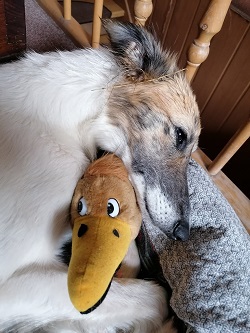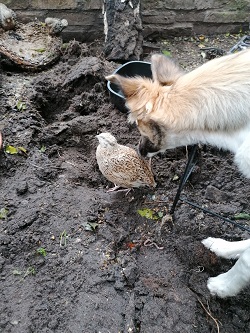 Auch in der Voliere hatte ich Yasha mit, es klappte prima. Ab und zu wurde das Federvieh über den Hof gejagt, aber eigentlich gehören diese Federdinger in einen Zwinger!