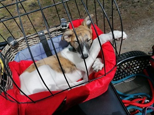 Um sicher zu sein das sie sich nicht erschrickt und los flitzt, übten wir das Kutsche fahren im Fahrradkorb. Auch unternahmen wir kurze Radtouren, liegend im Korb für die kleine Flitzefee.