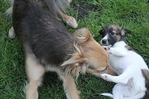 Spielekumpel begrüßt Yasha freundlich.(Dackel)