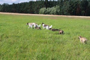 Wir fahren mit den Welpen Auto zu entfernten Wiesen und lassen sie dort buddeln und flitzen. Auf Spaziergängen werden die Wiesenflitzer zwischen durch immer